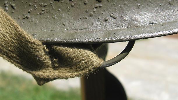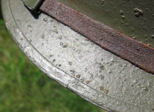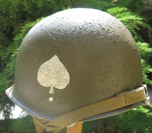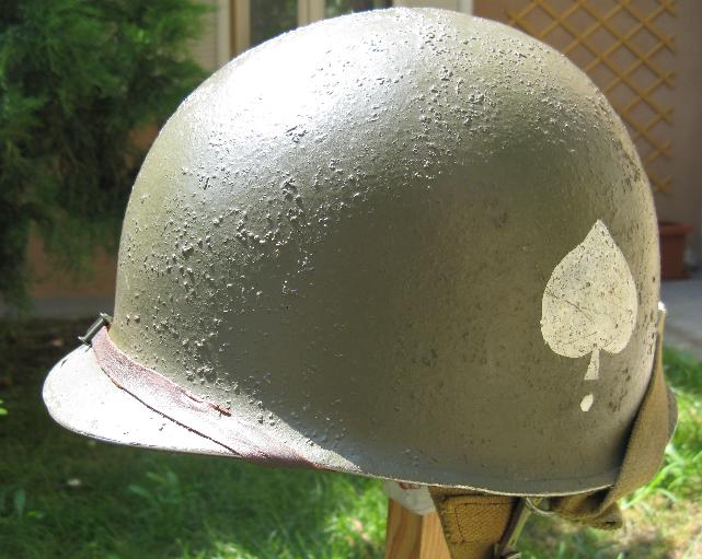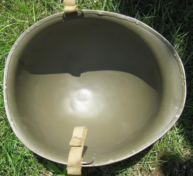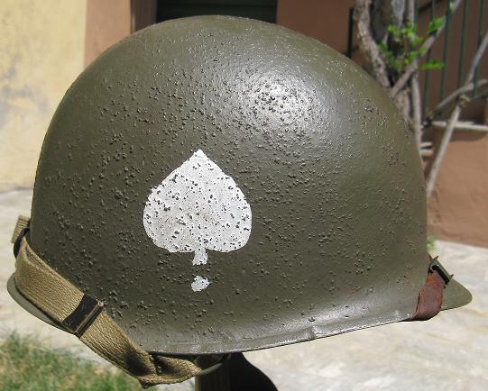 Ecco ora un elmetto M2 con ganci fissi a D RESTAURATO, sempre con fregi del 506th PIR, mentre come liner ho mantenuto quelle precedentemente postato; è un ex ganci fissi normali con giuntura anteriore che reca incisa la scritta 823A (mi sembra, è poco chiara, purtroppo) e il soggolo è rifatto.