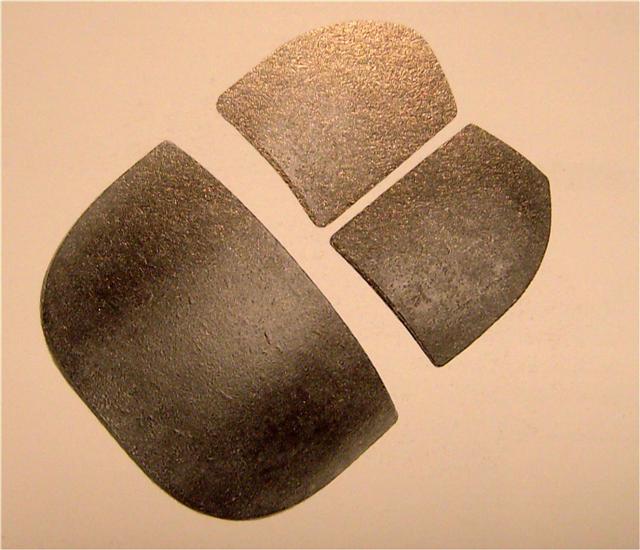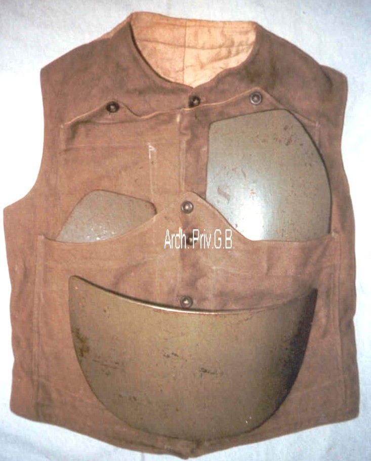 Didascalia: Trittico delle piastre d'acciaio del corpetto corazzato "Fariselli", costituito da un panciotto di tela robusta fornito di tre tasche riempite con corazzetta antiproiettile del peso complessivo di 7.500 grammi. Di concezione modernissima, questo corpetto era prodotto dalla "Compagnia Astori" di Milano. Duecento esemplari vennero acquistati dal governo inglese ed impegnati sul fronte francese.