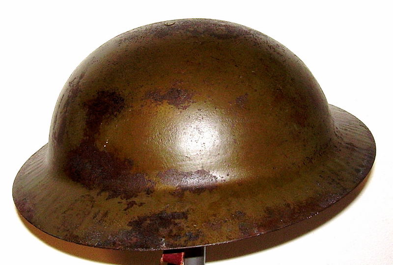 Si tratta di un elmetto un po' vissuto, come abbastanza normale che sia; come vedete rispetto all'Adrian è molto più largo, quasi rotondo, visto in pianta; ha un crestino molto piccolo; è molto più pesante rispetto agli Adrian ed è costruito in due pezzi, più il copribordo, tutto saldato, senza rivetti.