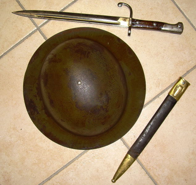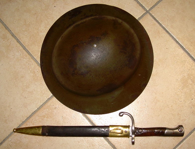 Questo elmetto è in condizioni molto buone ed è un cimelio familiare, che mi è stato ceduto insieme alla baionetta appartenuta alla stessa persona; la baionetta è di stile germanico e porta un marchio di una Ditta di Solingen; produzione tedesca o brasiliana su licenza?